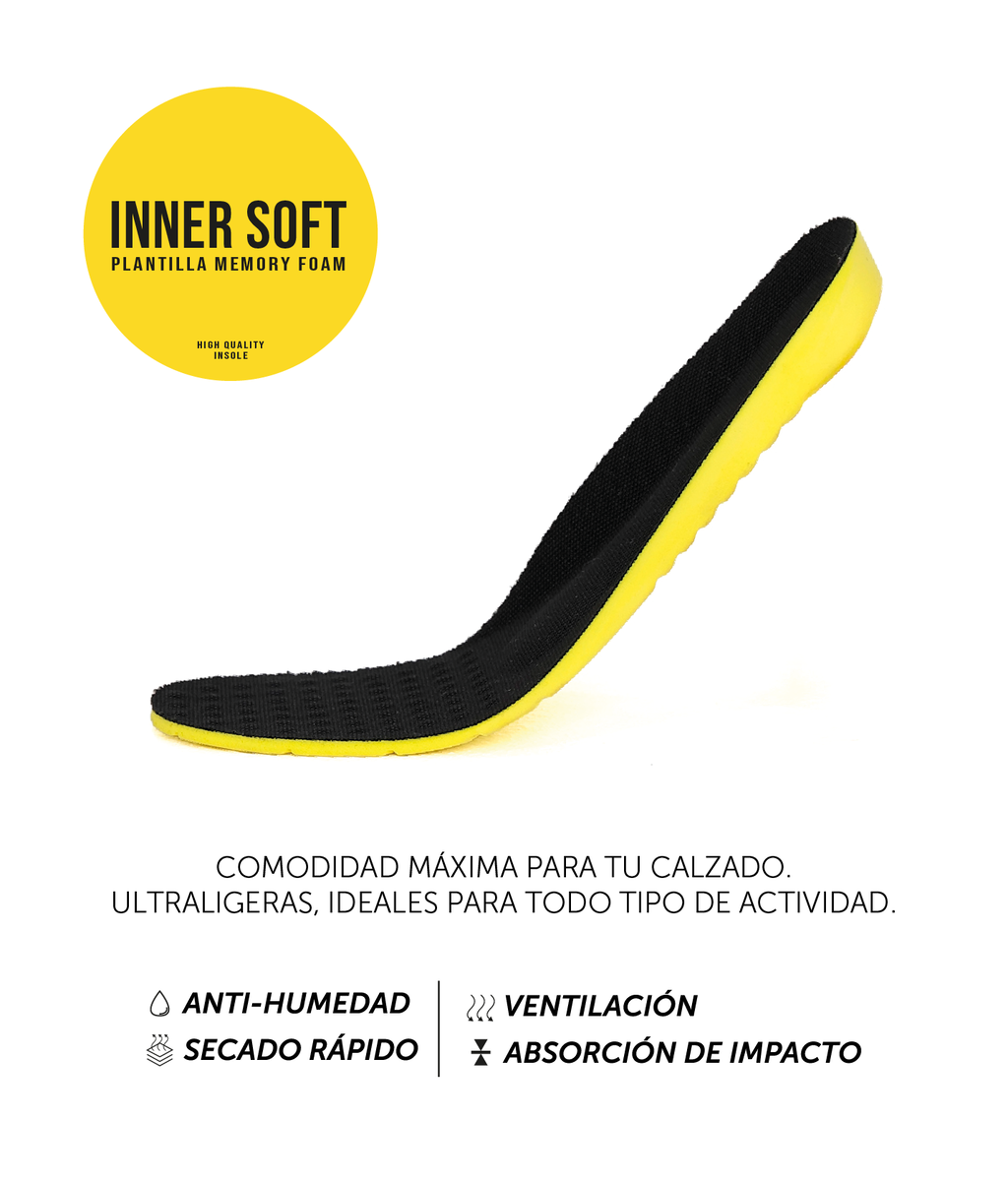 Capellada de sintético con tejido reforzado y descarne vacuno, cuello y lengueta acolchonado con espuma para mayor amortiguación protección. Con plantillas INNER SOFT